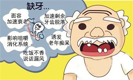 及时种牙修复重获健康缺牙将引发一系列的连锁反应。首先,当牙齿缺失后,人体的咀嚼效率会随之降低,唾液分泌减少,加重消化系统的负担,影响营养成分的吸收,严重的还会出现消化系统疾病。其次,牙齿缺失后,上、下颌骨间失去了支持,而且牙槽骨或整个颌骨因缺乏正常咀嚼力量的刺激,逐渐蜕变、萎缩,造成下巴的长度变短,面颊部和周围肌肉松弛,整个人看起来要比同龄人老得多。